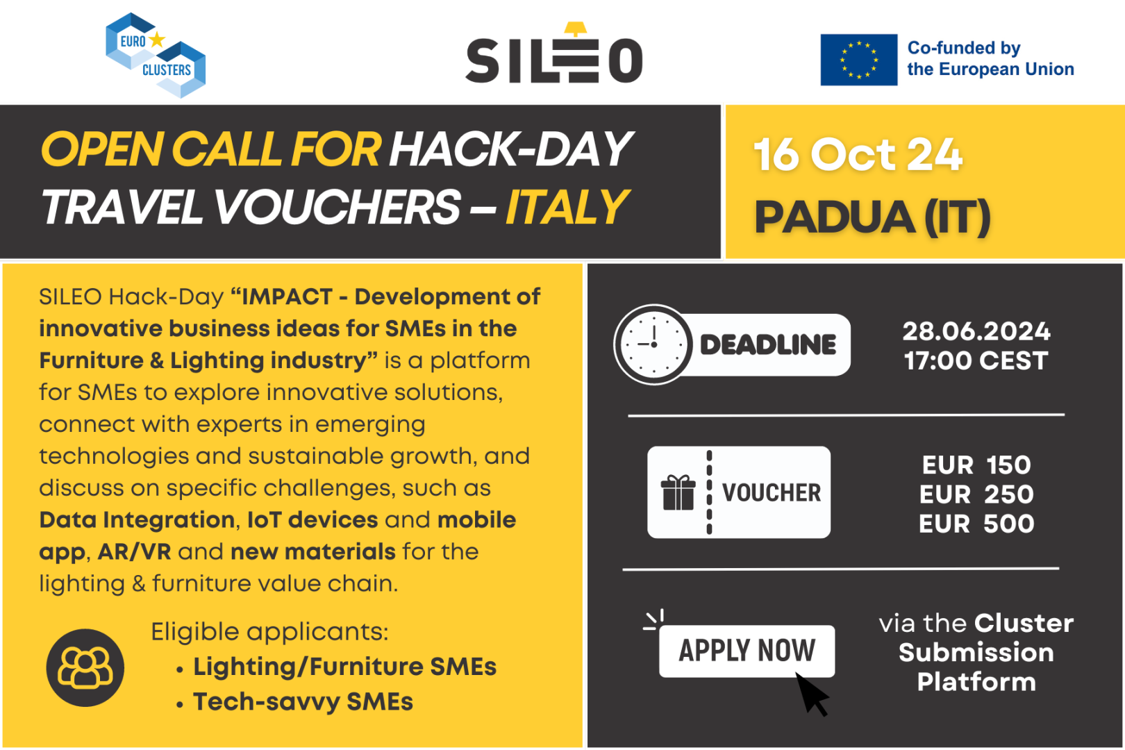 Don’t miss out on this incredible chance to attend the "IMPACT – Development of innovative business ideas for SMEs in the Furniture & Lighting industry" HackDay event organized by our Italian partner LUCE IN VENETO on October 16th in Padua, Italy!