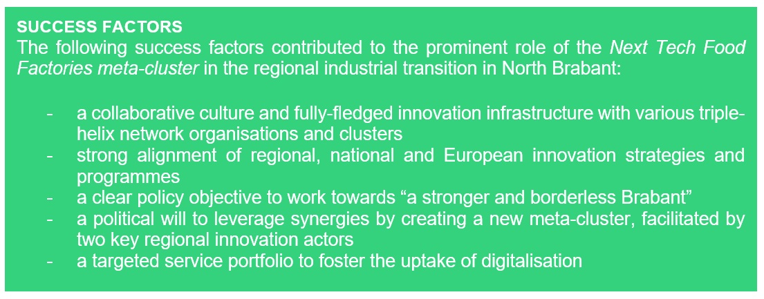 All of this required more intensive cooperation between the agri-food and high-tech sectors, especially in the development and testing phase. As a result, the two bodies formed the new meta-cluster Next Tech Food Factories (NTFF), which closely cooperates with 50 to 75 regional (and national) partners (companies, universities, branch organisations, intermediaries, clusters), thereby acting as a bridge between both worlds. In the spirit of the Brabant Agenda 2023, both organisations thereby contributed to the agenda’s objective, “a stronger and borderless Brabant”.
