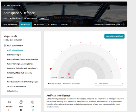 Megatrends are displayed for each of the 14 Industrial Ecosystems. You can find the megatrends after entering one of the 14 Industrial Ecosystems (see screenshot). Here, you can evaluate different megatrends for the Industrial Ecosystem and compare them with the In-manas benchmark.