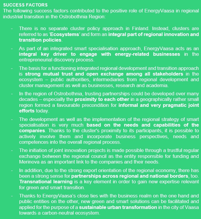 The case of EnergyVaasa and the Ostrobothnia region highlights the importance of mutual trust and a strong sense of cooperation among stakeholders from public and private sectors for integrated, strategic and hands-on econonomic development. Since trusting partnerhsips have been built up within the region for a long time, there is no need to further formalise existing cooperation structures, but rather to continue to use the short communication paths for effective measures in the context of smart and green transition. Moreover, the example of Ostrobothnia and EnergyVaasa illustrates very well that it is not only a matter of strong cooperation within the region, but that expertise from outside is also needed to master the challenging task of green and smart transition. Thus, international partnerships and projects have always played a central role in cluster and innovation-based regional economic development, too.