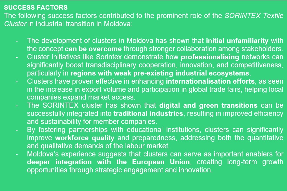 The case of the SORINTEX Textile Cluster emphasises the importance of targeted policy support in driving industrial transformation in Moldova. It highlights the need for professionalisation of networks to enhance collaboration and innovation, especially in regions with underdeveloped industrial ecosystems. Furthermore, the experience shows how clusters can be instrumental in promoting digital and green transitions by integrating advanced technologies and sustainable practices. The cluster’s success also emphasises the importance of internationalisation, with increased export volumes and global market access serving as key outcomes. Finally, Moldova’s cluster development illustrates the potential for deeper integration with the European Union through strategic partnerships and participation in innovation-driven projects.