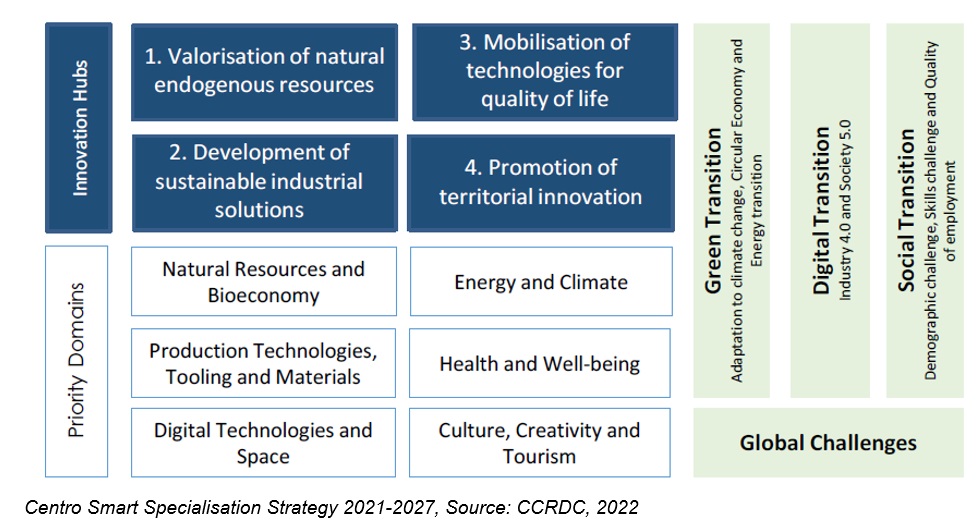 Portugal employs a multi-level strategy for smart specialisation (S3), comprising a national strategy and seven regional strategies. The Região Centro, in alignment with this approach, has developed its distinctive S3 strategy. The focal points of Centro's S3 priorities are encapsulated within four regional innovation hubs, each mirroring a key strategic challenge: