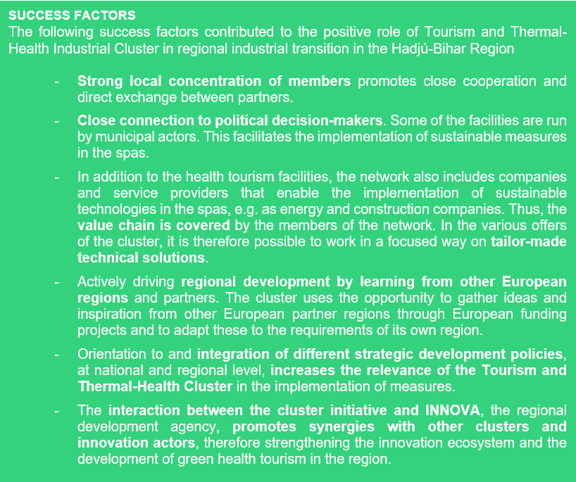 The case of the Tourism and Thermal-Health Industrial Cluster and the Hadjú-Bihar region shows how a region that is strongly evolving is mainly developing through political and strategic impetus. However, the implementation of strategic objectives and measures cannot succeed without functioning “agents of change”. The Tourism and Thermal-Health Industrial Cluster can successfully implement the transition towards a greener health tourism by including almost all spas and at the same time covering the necessary technology and service providers. Yet, the cluster does not act exclusively as an operational hand for developmental strategies, but provides members with access to international partners and good practices through participation in European projects. As a result, the cluster strengthens the perception of the region abroad and at the same time promotes the awareness of regional actors for influencing factors in international competition.