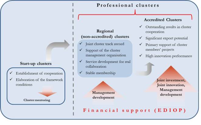 Cluster development model 2014-2020; Source: ECCP (2017): Evolution of cluster policy in Hungary - 2000-2020, https://clustercollaboration.eu/news/evolution-cluster-policy-hungary-2000-2020