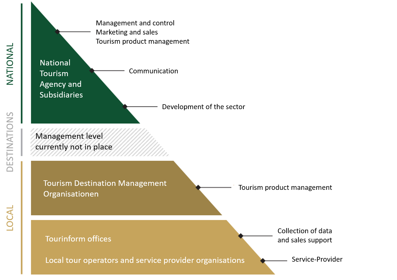 On the national level, the National Tourism Agency is in charge of the implementation and development of the Tourism 2.0 Strategy, which is the guiding strategy for the holisitc tourism development in the country. The agency is creating a new structure for tourism management at destination level to ensure better use of synergies, networking and a coherent approach to strategy and communication. At the municipal level, the management of local tourism areas is carried out by TDM (Tourism Destination Management) organisations. In 2019, there were more than 90 TDMs nationwide, which were mainly in the form of municipalities and associations. Accordingly, the central challenge is a holistic approach to the region. Relationships between local and cross-community actors are not well established and there is generally no coherent strategy. This leads to a high level of diversity at the national level. Therefore, the work is currently focused on creating consistent structures within the destinations.