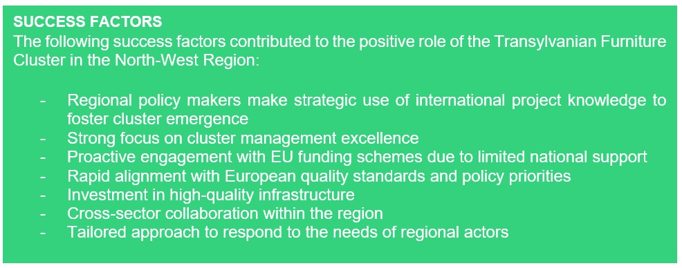 Summary: Since its establishement in 2012 the Transylvanian Furniture Cluster (TFC) has rapidly evolved into one of most advanced cluster intiatives of the North-West Region in Romania, representing and addressing the interests and needs of the Northern Transylvanian Furniture Industry. The region has a long-standing tradition in furniture manufacturing and has grown into a major production and export location, with many local companies supplying international brands. TFC aims to further strengthen the sector’s role within international value chains, by supporting product innovations and advancing digital and sustainable production processes. Initially founded with support from the North-West Regional Development Agency, TFC emerged in a context of limited national support, resulting in early strategic orientation towards international cooperation and EU funding instruments. Driven by the need to strengthen competitivness, the cluster has continuously invested in high-quality infrastructure, such as the Center of Excellence in Furniture (CEF) and has become a regional hub for product development, prototyping, and knowledge exchange. Through its participation in numerous European projects, the GOLD labelled cluster has developed strong international linkages, enhanced its service portfolio, and contributed to regional policy dialogue. Its evolution demonstrates how early engagement in European cooperation, combined with strong regional cross-sectoral cooperation and a clear focus on cluster management excellence can accelerate long-term competitiveness.